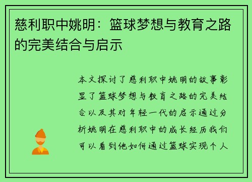本文探讨了慈利职中姚明的故事,彰显了篮球梦想与教育之路的完美结合,以及其对年轻一代的启示。通过分析姚明在慈利职中的成长经历,我们可以看到他如何通过篮球实现个人价值,同时又不忘学业的重要性。在教育和体育之间,他成功地架起了一座桥梁,成为学生们追求梦想的榜样。文章将从多个维度深入剖析这一现象,包括姚明的...